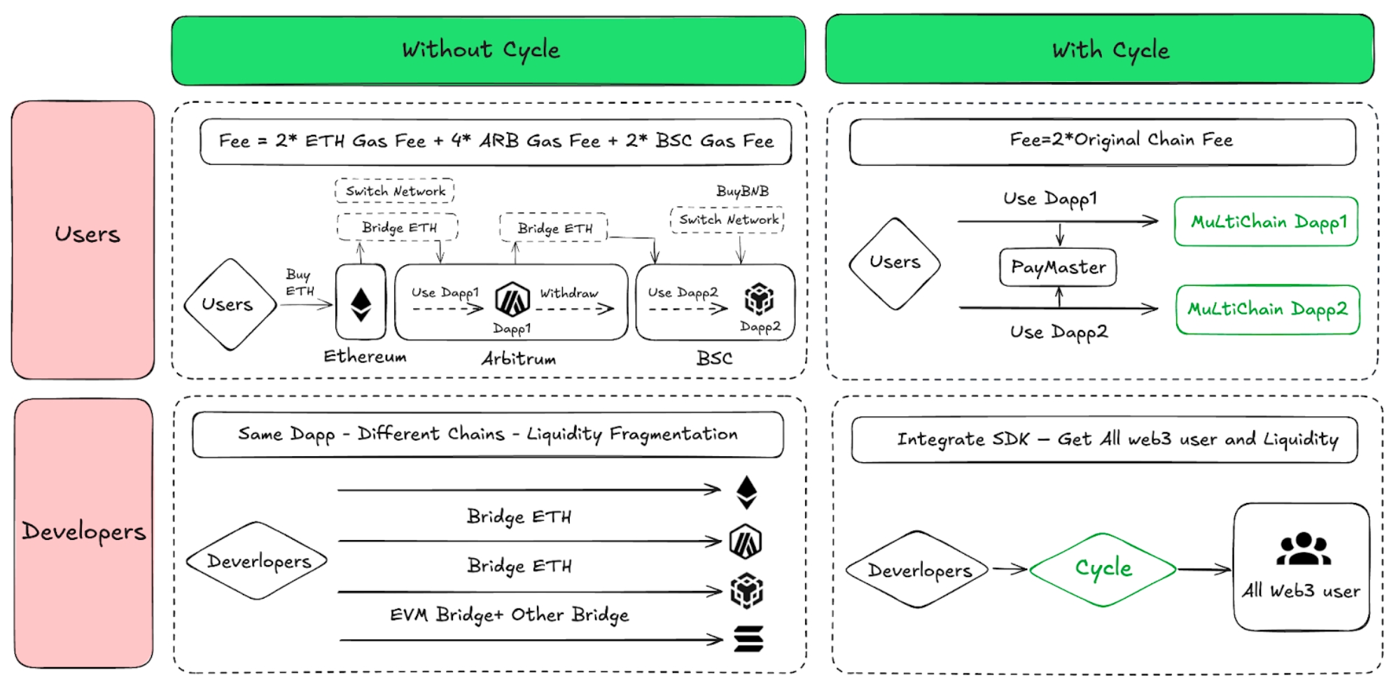 Cycle Network introduces a decentralized, bridgeless hub that seamlessly interconnects all blockchains. With the proliferation of Layer 2 solutions and numerous chains, this innovation ensures that end-users and developers are no longer isolated or fragmented. It enables everyone to share liquidity, pay gas fees, and sign transactions without the need for traditional bridges. In the next section, we will explore the impact of Cycle Network's integration on end users and developers—two of the most crucial participants in the Web3 ecosystem.