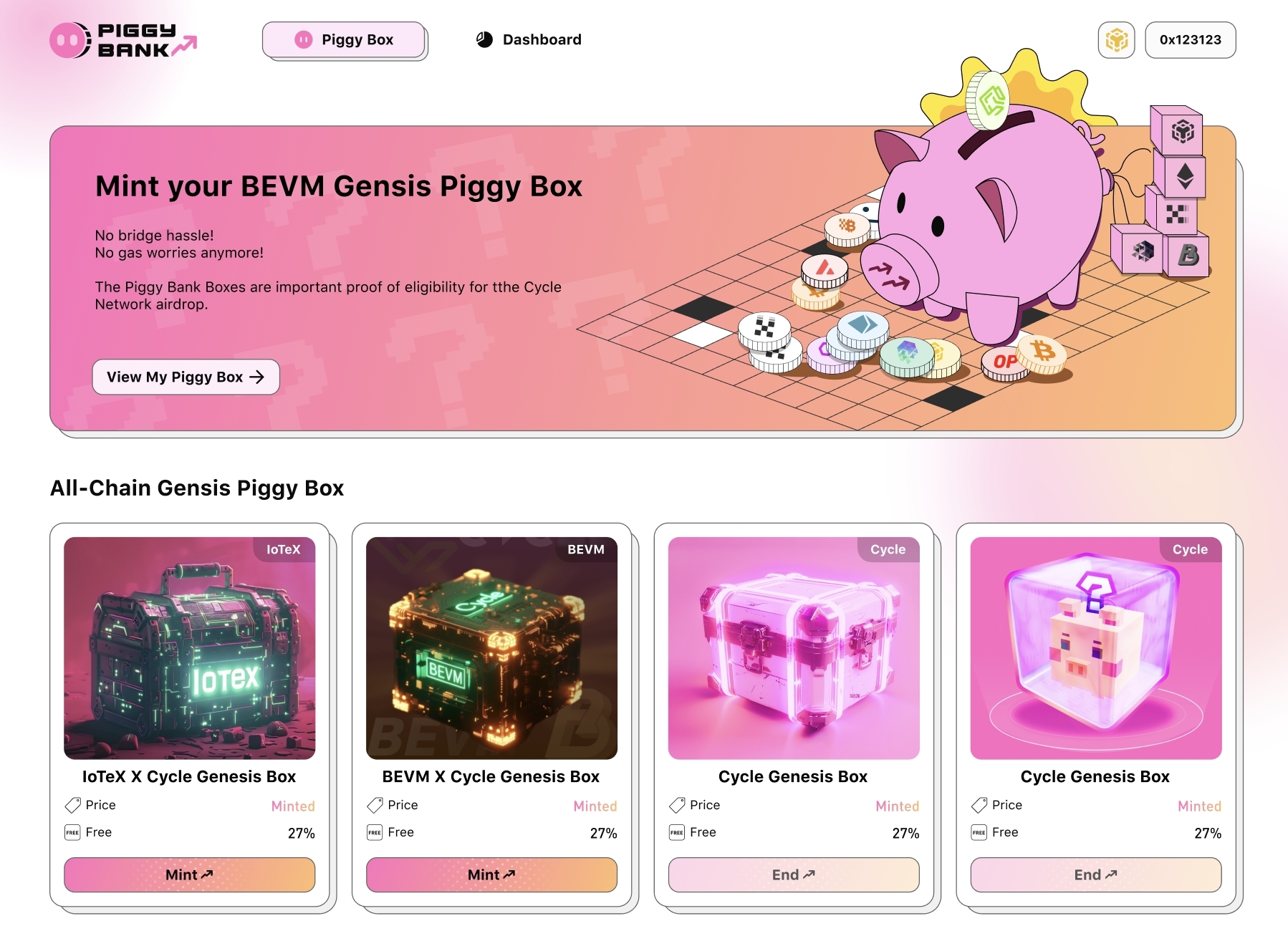 Piggy Bank’s highly anticipated Piggy Box event has seen over 246K accounts, with nearly 190K assets minted in a bridgeless manner. Users from any chain can mint assets with a single click without leaving their native chain. Transactions, gas fees, and signatures are handled seamlessly on the user’s preferred chain (such as IoTeX, BEVM (BTC L2), Arbitrum, BASE, BeraChain), while receiving assets on the project’s issuing chain. Quickly enter Piggy Bank to experience the revolutionary Cycle Bridgeless Mint Asset and mint your first Genesis Piggy Box.